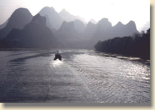 私は今、桂林で川下りをしています。遊覧船は段々墨絵の世界に入っていきます。胴長の独特の形をした山々は、黒から灰色へのグラデーション。そこに霧のカーテンがおおっています。まるで夢の世界に入っていくようでした。もう一度夢を見にここを訪れたい・・・・